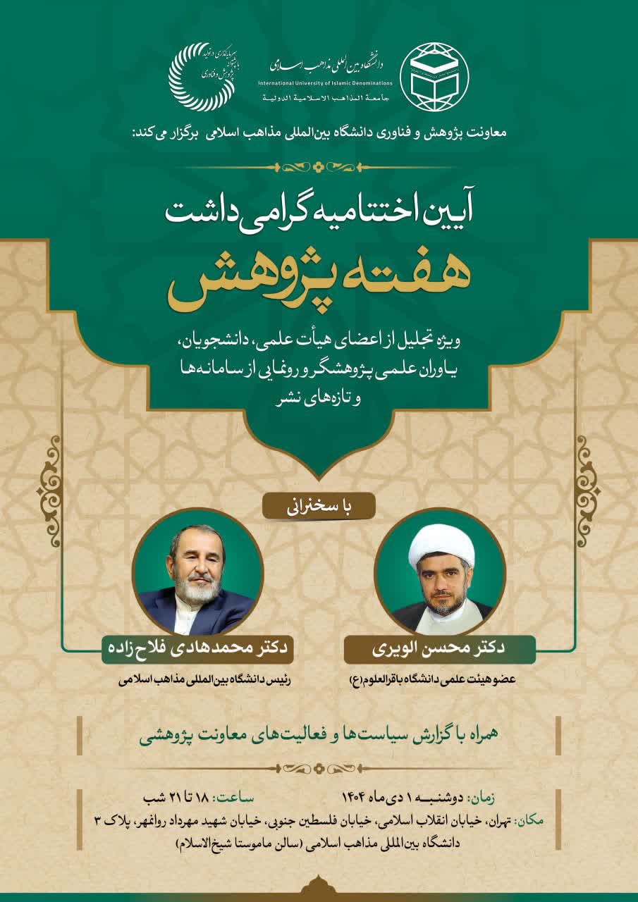 معاونت پژوهش دانشگاه بین‌المللی مذاهب اسلامی، در راستای پاسداشت مقام پژوهش و پژوهشگران، آیین اختتامیه گرامی‌داشت هفته پژوهش را برگزار می‌نماید.